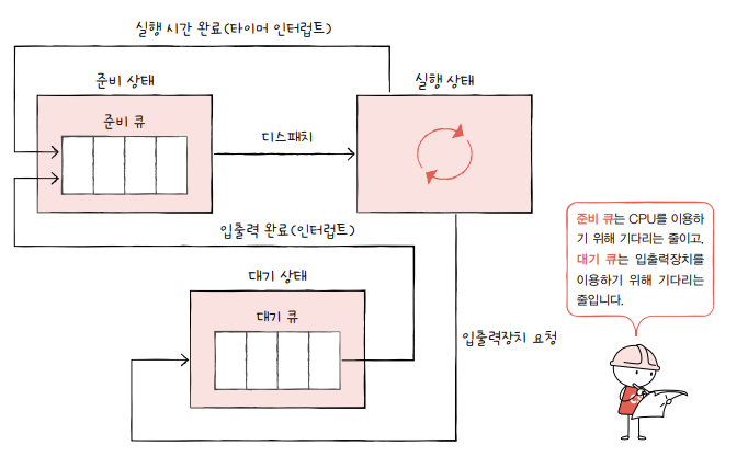 준비 큐는 CPU를 이용하고 싶은 프로세스들이 줄을 서는 큐이며,